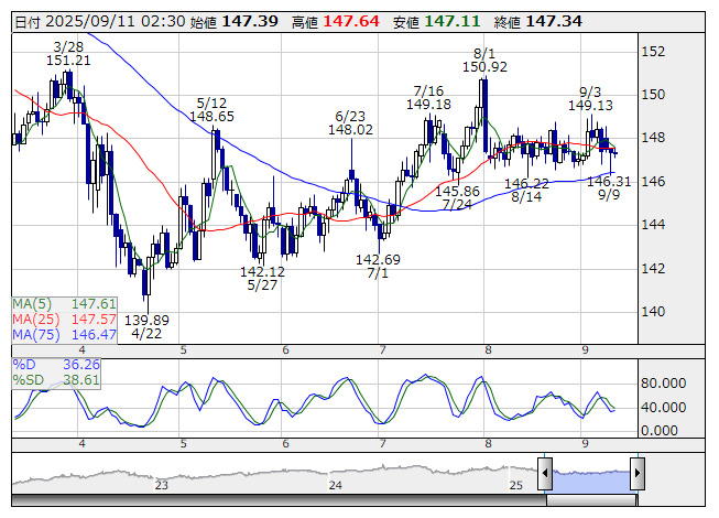 良好な入札結果で米国債相場は下げ止まり。10年債利回りは4.022%まで低下し4月来で最低となった。ドル・円は147円25銭までじり安推移した。