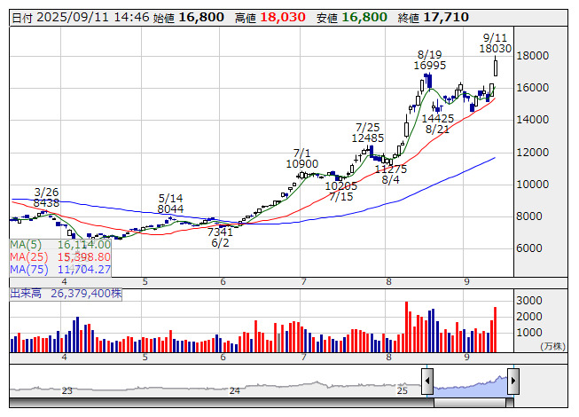 9984>は大幅続伸。PPIが予想外のマイナスとなったことで米長期金利が低下し、ナスダック指数が堅調な推移となっており、支援材料につながっている。さらに、傘下企業である英アームが9.5%と急騰、含み益の拡大が意識される形で刺激材料ともなっているもよう。アームは、スマホや腕時計などのモバイル機器上でAIが動作するように最適化した「ルメックス」と呼ばれる次世代チップ設計をローンチすると発表しており、材料視されたようだ。