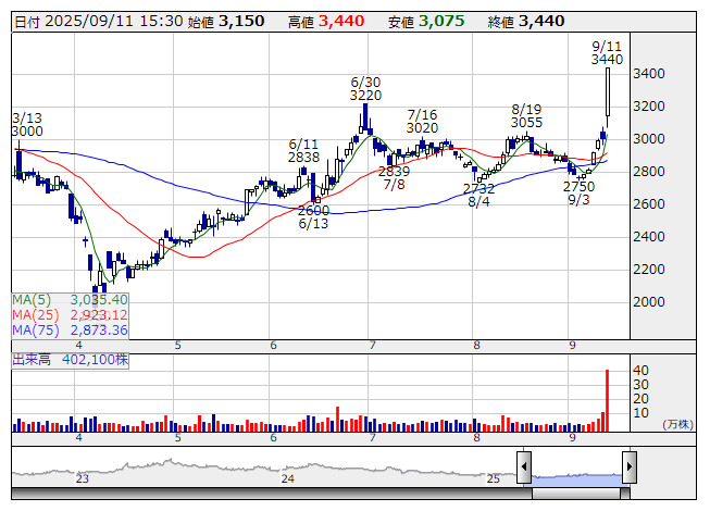 ■扶桑電通 <7505> 3,685円 +295 円 (+8.7%) 本日終値