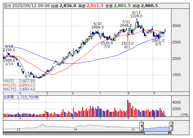 1. <6526> ソシオネクス 東証P 5,031 2878 ( +3.3 ) 日経225採用