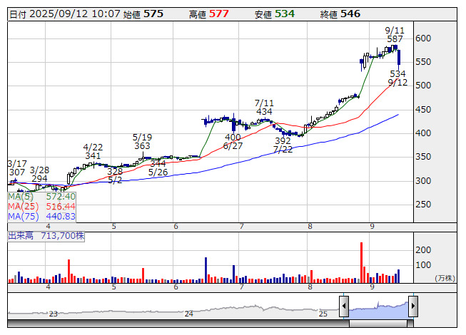 明豊エンタ <日足> 「株探」多機能チャートより■財務省 : 9月12日受付