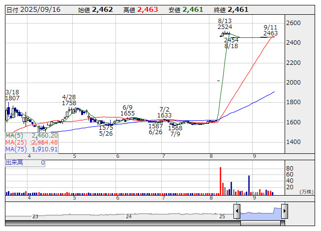 4464>はストップ高買い気配。投資ファンドのエフィッシモ・キャピタルがTOBの実施を発表している。TOB期間は16日から10月29日までで、TOB価格は4100円。発行済み株式数の92%を取得するとしている。現在、同社ではMBOを表明し、2465円でTOBを実施中。エフィッシモでは、MBOの買い付け価格は著しく割安な水準で、少数株主利益が保護されていないと主張しているようだ。会社側では正式な連絡は行われていないとしている。