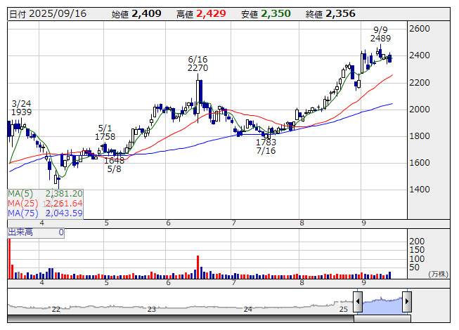 ストップ安売り気配。25年10月期業績予想の売上高を63.26億円から65.41億円(3.4%増)へ、税引前利益を12.61億円から13.74億円(8.9%増)へ上方修正した。基幹事業であるメディア事業が好調に伸長したことに加え、HR事業が初めて黒字で着地する見込みであることなど好調に推移したとしている。また、好調な業績を受けて、配当性向30%に基づいて算出し、期末配当予想を33円90銭から37円80銭へ3円90銭引き上げた。ただ、上値は重く、売りが優勢となっている。