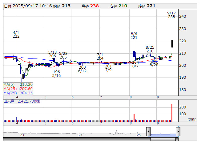 2025年09月17日10時16分 【材料】中京医薬は商い伴い急動意、エムポックス重症型が国内初確認 中京医薬 <日足> 「株探」多機能チャートより 中京医薬品<4558>が商いを伴って急動意。天然痘に似た症状を持つ感染症「エムポックス(サル痘)」について、重症化しやすい「クレード1b」の感染が国内で初めて確認されたことが16日に明らかとなった。これを受け、コロナ禍の時期に折に触れ物色された感染症対策関連株の一つである同社に思惑的な買いが向かっているようだ。 出所:MINKABU PRESS