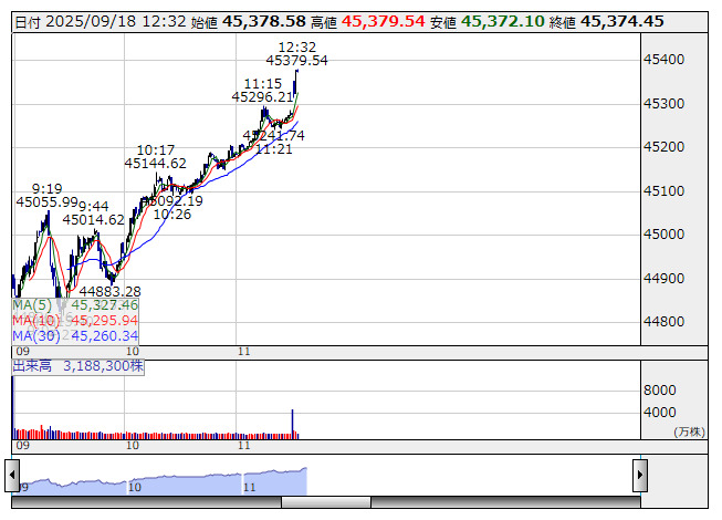 2025年09月18日12時32分 【市況】東京株式(後場寄り付き)=日経平均株価は前場終値比で上げ幅拡大 日経平均 <1分足> 「株探」多機能チャートより 後場寄り付き直後の東京株式市場では、日経平均株価が前営業日比560円高前後と前場終値と比較して上げ幅を拡大。外国為替市場では1ドル=146円90銭台で推移している。 出所:MINKABU PRESS