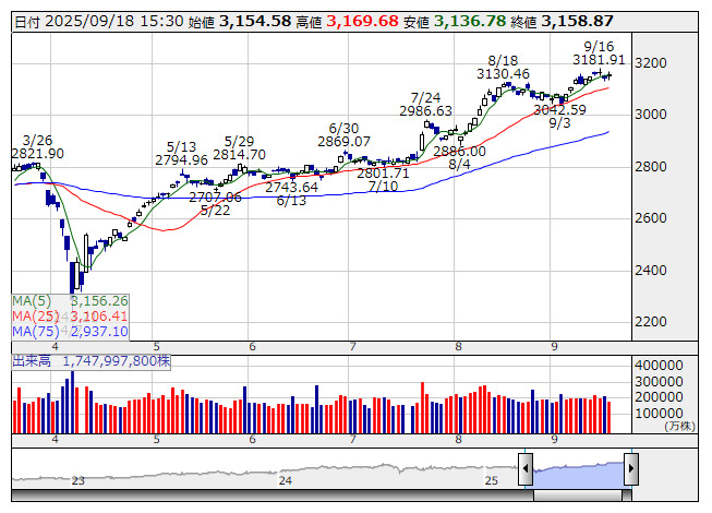 TOPIX <日足> 「株探」多機能チャートより日本取引所が公表した先物手口情報によると、9月18日のTOPIX先物期近(2025年12月限)の夜間取引(立会内・J-NETの合算)で、取引高トップはABNクリアリン証券の9792枚だった。