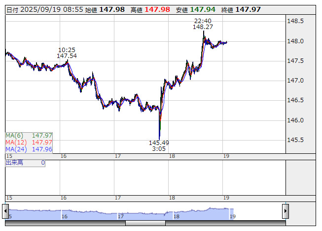 2025年09月19日09時01分 【通貨】外為:1ドル147円96銭前後と大幅なドル高・円安で推移 米ドル/円 <5分足> 「株探」多機能チャートより 19日の外国為替市場のドル円相場は午前9時時点で1ドル=147円96銭前後と、前日午後5時時点に比べ85銭の大幅なドル高・円安。ユーロ円は1ユーロ=174円44銭前後と38銭のユーロ高・円安で推移している。 株探ニュース