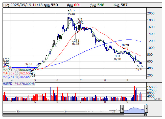 メタプラ <日足> 「株探」多機能チャートよりこの日の東京株式市場でメタプラは反発。同社はホテル事業を手掛けるが、近年はビットコインの保有を進めるなど仮想通貨(暗号資産)分野に注力している。ビットコイン価格の上昇を手掛かりに物色人気化し、6月に1930円の高値をつけたものの、その後は調整局面入り。足もと500円台まで水準を切り下げている。きょうは目先反発したものの、下値メドが依然みえないなか売りを予想する向きが増えたようだ。