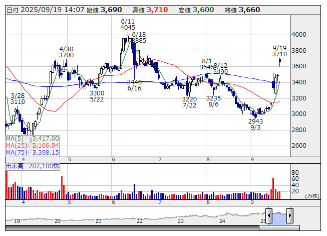 9279>が大幅に5日続伸。大和証券は18日、同社株の投資判断を「3(中立)」から「2(アウトパフォーム)」に引き上げた。目標株価は3750円から3850円に見直した。同社は「横浜家系」などのラーメン店を運営しており、25年10月期第3四半期累計(24年11月~25年7月)の連結営業利益は前年同期比15.1%増の23億7500万円となった。既存店の好調に加え、第1四半期時点で課題となった人件費上振れは4月からの人員配置の適正化で解消している、と指摘。退職率の低下と順調な採用で、課題となっていた人手不足が解消したことから、26年10月期以降の出店ペース拡大を見込んでいる。株価の調整も進みレーティングを引き上げている。