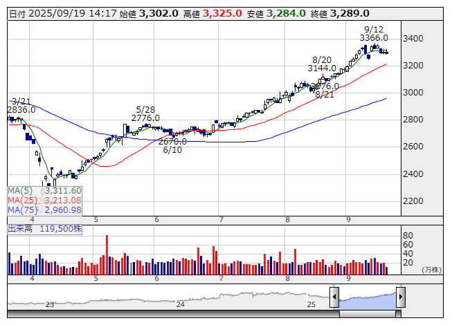 長瀬産 <日足> 「株探」多機能チャートより■財務省 : 9月19日受付