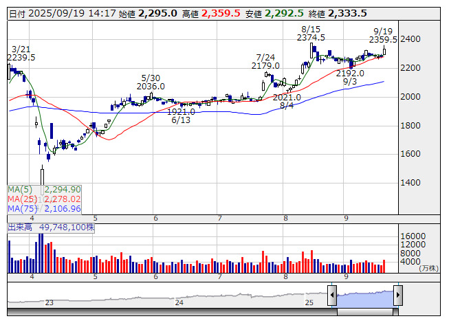 8411>が後場に買われ、銀行株は軒並み高。日経平均が急落するなかにあって、東証の業種別指数で銀行業は上昇率トップとなっている。日銀はこの日まで開いた金融政策決定会合で、政策金利の据え置きを決めた。同時にETF(上場投資信託)の市場売却を決めたことを受け、日経平均は後場に一時800円を超す下げとなったが、今回の会合では高田創審議委員と田村直樹審議委員が、政策金利0.5%の据え置きの方針に反対した。そのうえで、政策金利を0.5%から0.75%に引き上げるための議案が提出されたが、こちらは反対多数で否決されたという。こうした議論の過程から、日銀が次回会合以降、早期に利上げに踏み切るとの思惑が金融市場において台頭し、金利上昇メリットの銀行株への物色意欲が高まったようだ。