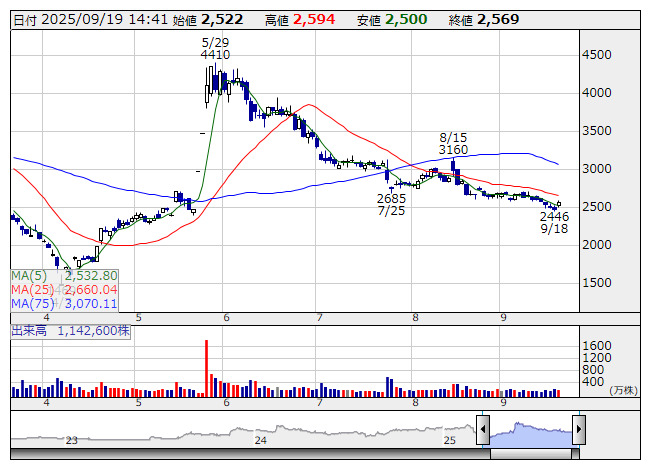 ジーエヌアイ <日足> 「株探」多機能チャートより