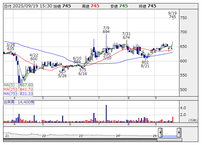 ビートレンド <日足> 「株探」多機能チャートより個別ではビートレンド<4020>、Institution for a Global Society<4265>がストップ高。ジェネレーションパス<3195>は一時ストップ高と値を飛ばした。カウリス<153A>、マテリアルグループ<156A>、WOLVES HAND<194A>、オプロ<228A>、サンクゼール<2937>など20銘柄は年初来高値を更新。サンバイオ<4592>、ビズメイツ<9345>、Birdman<7063>、QDレーザ<6613>、トゥエンティーフォーセブンホールディングス<7074>は値上がり率上位に買われた。