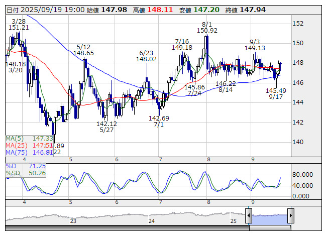 2025年09月19日19時01分 【通貨】外為:1ドル147円95銭前後と横ばい圏で推移 米ドル/円 <日足> Slowストキャス 「株探」多機能チャートより 19日の外国為替市場のドル円相場は午後7時時点で1ドル=147円95銭前後と、午後5時時点に比べ2銭のドル高・円安と横ばい圏。ユーロ円は1ユーロ=174円00銭前後と12銭のユーロ安・円高で推移している。 株探ニュース