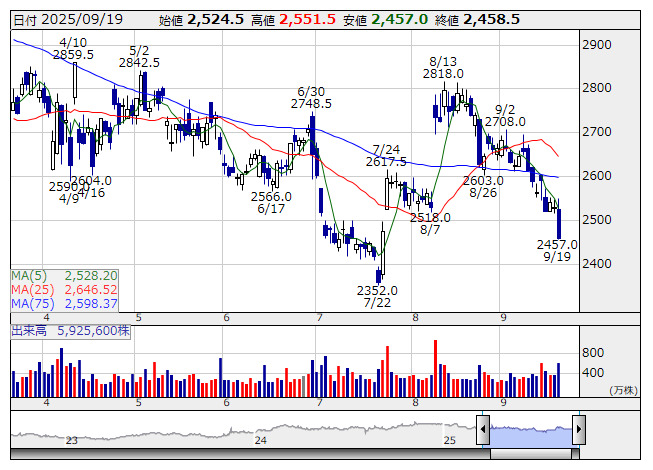 テルモ <日足> 「株探」多機能チャートより■財務省 : 9月19日受付