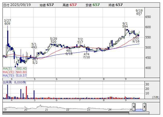 テノ.HD <日足> 「株探」多機能チャートより■テノ.HD <7037> 657円 (+100円、+18.0%) ストップ高
