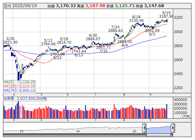 2025年09月22日08時46分 【市況】TOPIX先物:22日寄り付き=16ポイント高、3134ポイント TOPIX <日足> 「株探」多機能チャートより 22日8時45分、TOPIX先物期近2025年12月限は前週末清算値比16ポイント高の3134ポイントで寄り付いた。前週末のTOPIXの現物終値3147.68ポイントに対しては13.68ポイント安。 株探ニュース