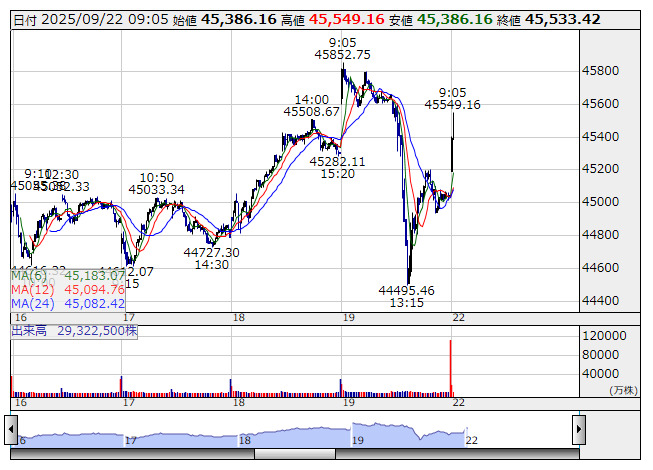 2025年09月22日09時08分 【市況】日経平均の上げ幅が500円突破 日経平均 <5分足> 「株探」多機能チャートより 日経平均株価の上げ幅が500円を突破。9時7分現在、503.35円高の4万5549.16円まで上昇している。 株探ニュース