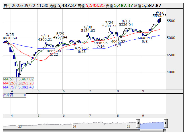 電気機器 <日足> 「株探」多機能チャートより●東証33業種 値上がり: 27 業種 値下がり: 6 業種