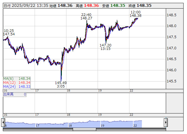 米ドル/円 <5分足> 「株探」多機能チャートより22日午後の東京市場でドル・円は小動きとなり、午前中に本日高値148円37銭まで上昇後、高値圏を維持する。また、日経平均株価は前週末比600円超高と強含み、円売り地合いに振れやすい。ただ、重要イベント通過で積極的な売り買いは抑制された。