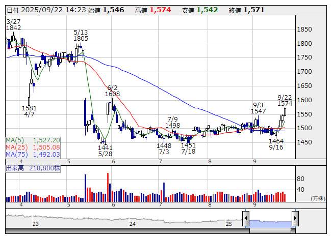 2025年09月22日14時27分 【テク】Eギャランティ---200日線(1635円)が次のターゲット イー・ギャラ <日足> 「株探」多機能チャートより <8771> Eギャランティ 1571 +26 6営業日続伸で9月3日につけた直近戻り高値を明確に突破し、一目均衡表では雲を上抜けてきた。遅行スパンは上方シグナルを発生させている。200日線(1635円)が次のターゲットとして意識されてくることで、5月半ばの急落局面で空けたマド(1609-1750円)が射程にはいってきそうだ。 《FA》 提供:フィスコ