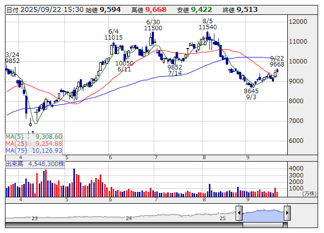<7012> 川崎重工業 9513 +56 ( +0.6%) 9308.6 9254.9
