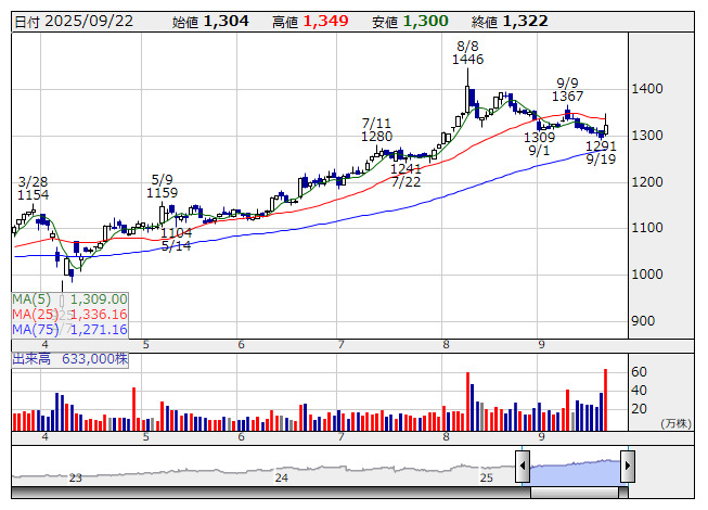 ディアライフ <日足> 「株探」多機能チャートより東証プライム上場銘柄で9月26日に権利付き最終日を迎える9月の期末配当もしくは中間配当(記念・特別配当も含む)による利回りの高い上位30銘柄を取り上げました。これから配当狙いで買った場合に得られる配当金額とその利回りを示しています。年間ベースの配当金額およびその利回りではありません。(9月22日現在)