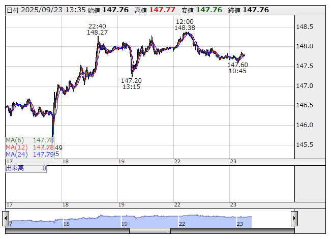 米ドル/円 <5分足> 「株探」多機能チャートより23日午後の東京市場でドル・円は動意が薄く、147円70銭台でのもみ合いが続く。東京市場の休場で材料難となり、積極的に動きづらい。米10年債利回りの下げ渋りで、ドルは売りづらい。半面、アジア株安が続き、リスク回避的な円買いが入りやすい。