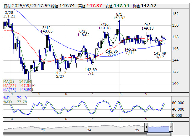 米ドル/円 <日足> Slowストキャス 「株探」多機能チャートより欧州市場でドル・円は軟調地合いとなり、147円77銭から147円53銭まで値を下げた。ポンド・円の下落に追随した値動き。英国のPMIは製造業、サービス業とも悪化し、ポンドは円のほかドル、スイスフラン、豪ドルに対しても弱含む展開となった。