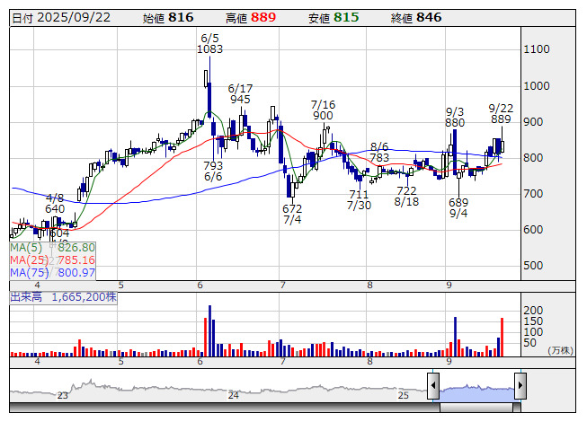 スターシーズ <日足> 「株探」多機能チャートより■スターシーズ <3083> 846円 (+35円、+4.3%)