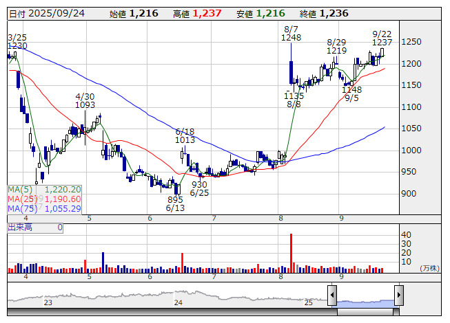 8月安値303円を直近安値にルバウンドを継続しており、上値を抑えられていた75日線を突破し、同線から上放れる形状をみせてきている。25日線と75日線とのゴールデンクロスが接近。一目均衡表では雲上限での攻防から雲を上放れてくる可能性が高い。遅行スパンは上方シグナルを継続させており、6月高値(377円)を射程に入れたリバウンドが期待されそうだ。