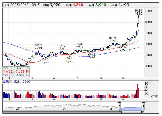4971>が続急騰で連日の年初来高値更新。週明け22日に商い増勢のなか大幅高で急勾配の5日移動平均線を大きく上放れたが、きょうも目先筋の利益確定売りを吸収し上げ足を加速した。一時13.6%高と値を飛ばしプライム市場の値上がり率トップとなった。電子パッケージ基板や部品などの製造プロセスに必須である金属表面処理薬品で世界屈指の実力を有し、半導体パッケージ銅表面処理剤で世界トップシェアを誇る。AIサーバー向けなどの高性能品で旺盛なニーズを捉えており、収益成長期待が株価押し上げの原動力となっている。