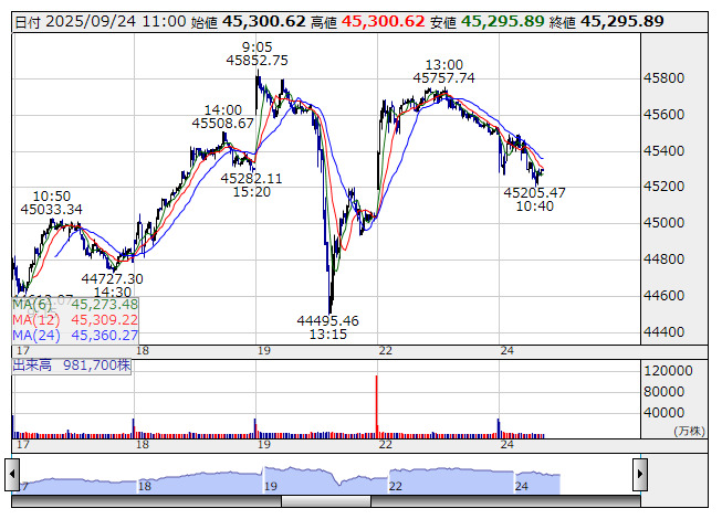 【市況】11時の日経平均は195円安の4万5297円、アドテストが98.59円押し下げ