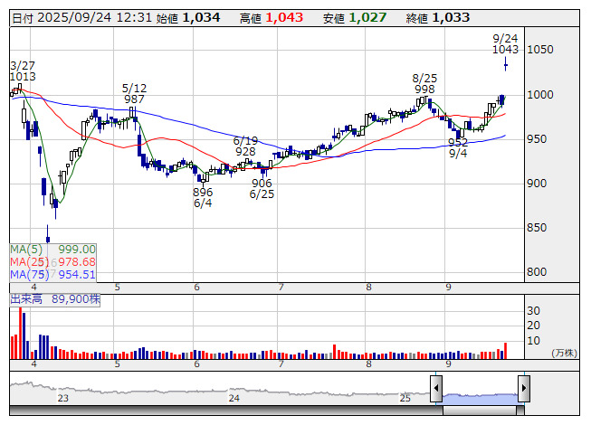 大幅反落。一昨日に8月の月次動向を発表、営業利益は前年同月比33.6%増となり、25年10月期に入ってからは最大の伸び率となっている。ただ、5-6月の円高反転のプラス影響が反映されるタイミングでもあったため、増益率の伸長は想定線とみられているもよう。一方、店舗への商品出荷実績は既存店ベースで同0.8%増にとどまり、25年10月期では最も低い伸びとなっている。前年は米価高騰の影響で米の売上が伸長していたようだ。