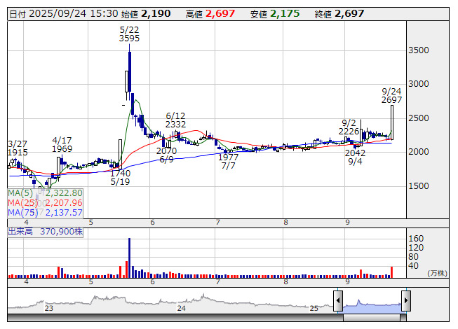 DMP <日足> 「株探」多機能チャートより個別ではディジタルメディアプロフェッショナル<3652>、アディッシュ<7093>がストップ高。データセクション<3905>は一時ストップ高と値を飛ばした。ハッチ・ワーク<148A>、Will Smart<175A>、WOLVES HAND<194A>、オプロ<228A>、サンクゼール<2937>など25銘柄は年初来高値を更新。BlueMeme<4069>、トゥエンティーフォーセブンホールディングス<7074>、FRONTEO<2158>、Waqoo<4937>、スリー・ディー・マトリックス<7777>は値上がり率上位に買われた。