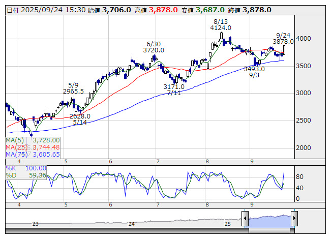 <7011> 三菱重工業 3878 +196 ( +5.3%) 3744.5