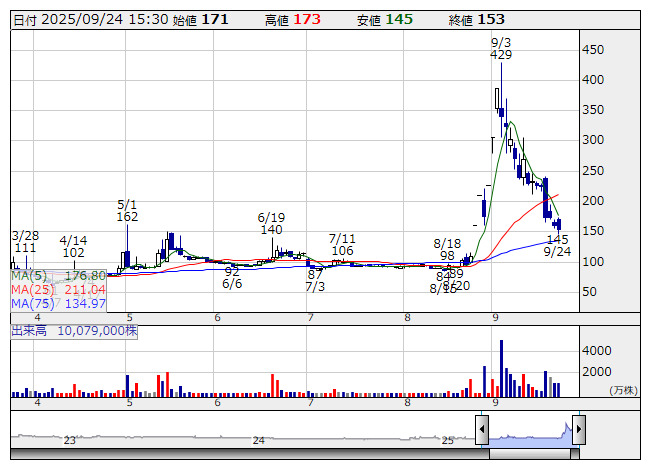 2025年09月24日16時50分 【市況】明日の【信用規制・解除】銘柄 (24日大引け後 発表分) Defコン <日足> 「株探」多機能チャートより ○Defコン <4833> [東証G] 東証が25日売買分から信用取引の臨時措置(委託保証金率を50%以上[うち現金20%以上]とする)を解除する。日証金も増担保金徴収措置を解除。 [2025年9月24日] 株探ニュース