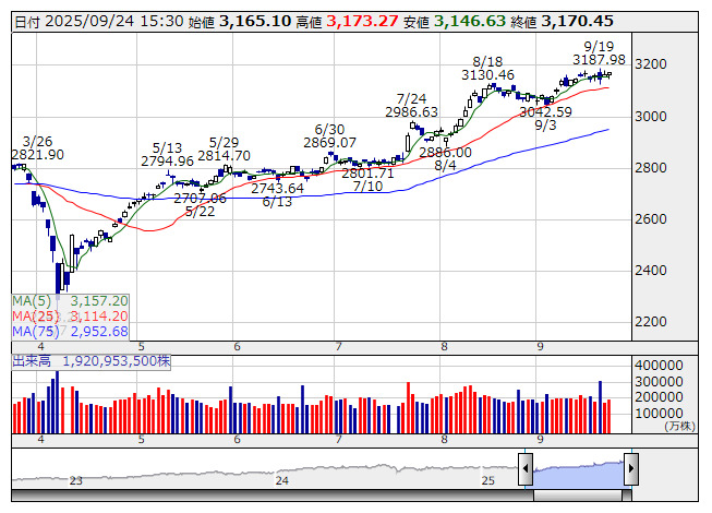 TOPIX <日足> 「株探」多機能チャートより日本取引所が公表した先物手口情報によると、9月24日のTOPIX先物期近(2025年12月限)の夜間取引(立会内・J-NETの合算)で、取引高トップはABNクリアリン証券の1万5955枚だった。
