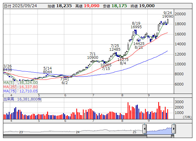 SBG <日足> 「株探」多機能チャートより(東証上場 4249 銘柄対象[ETF、REIT含む])