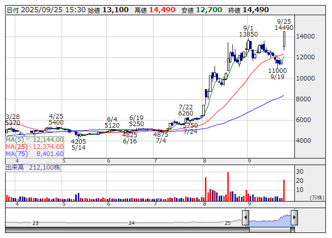 日精鉱 <日足> 「株探」多機能チャートより日本精鉱<5729>がストップ高。家電や自動車などに使われるアンチモン及びその化合物の製造を手掛けているが、中国のアンチモン関連製品の輸出管理の影響などを背景に、販売価格が急上昇していることが収益を押し上げている。24日取引終了後、同社は26年3月期の業績予想の修正を発表。売上高は従来予想の349億円から402億円(前期比60%増)に、営業利益は33億8000万円から53億円(同47%増)に大幅増額した。また、好業績を背景に株主還元も強化し、今期年間配当を従来計画の240円から340円(前期実績は200円)に大きく上乗せすることも併せて発表しており、これらを好感する形で投資資金が集中した。