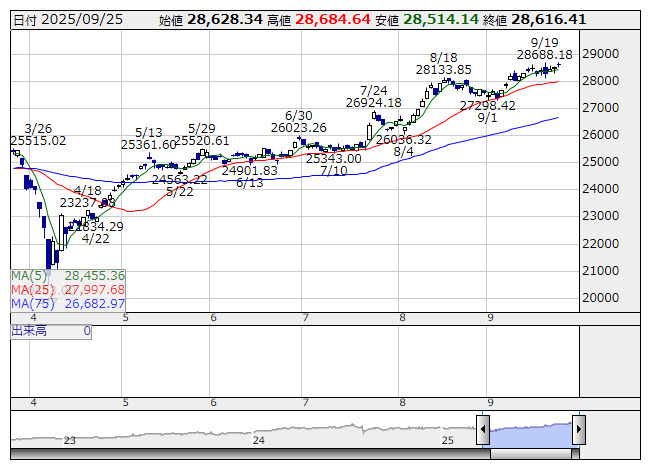 2025年09月26日08時46分 【市況】JPX日経400先物:26日寄り付き=変わらず、2万8385ポイント JPX日経400 <日足> 「株探」多機能チャートより 26日8時45分、JPX日経インデックス400先物期近2025年12月限は前日清算値比変わらずの2万8385ポイントで寄り付いた。前日のJPX日経インデックス400の現物終値2万8616.41ポイントに対しては231.41ポイント安。 株探ニュース