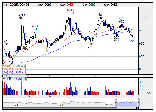 3日につけた8645円をボトムに200日線が支持線として機能する形でリバウンドをみせており、直近で25日線を突破し、75日線に接近してきた。75日線を明確に上抜けてくると、8月高値11540円を射程に入れたトレンド形成が意識されてきそうだ。一目均衡表では雲を下回って推移しているが薄い雲であり、突破を試す展開に期待。遅行スパンは実線に接近してきており、上方シグナルを発生させてきそうだ。