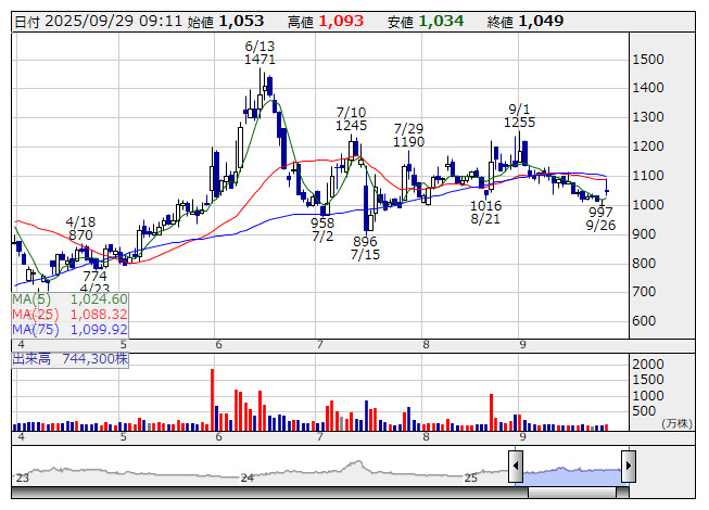 5246>がカイ気配スタートとなり、一時9%を超える上昇で1093円まで大きく株価水準を切り上げる場面があった。画像解析及び顔認証など生体認証を活用したクラウド型本人確認サービスなどを手掛けており、金融機関向けを中心に需要を開拓している。前週末26日取引終了後、総務省の「デジタルインフラ整備基金助成事業」の公募に同社グループ会社が実施事業者として採択されたことを発表、これを材料視する形で投資資金が集中した。