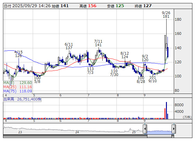 この発表を受けて、25日のDWTI株はストップ高の158円に急伸。26日も一時181円に上昇した。ただ、この日は大幅続落となっており、買い一巡との見方から売り予想数が上昇しているようだ。