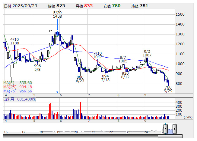 ミガロHD <日足> 「株探」多機能チャートより(東証上場 4243 銘柄対象[ETF、REIT含む])