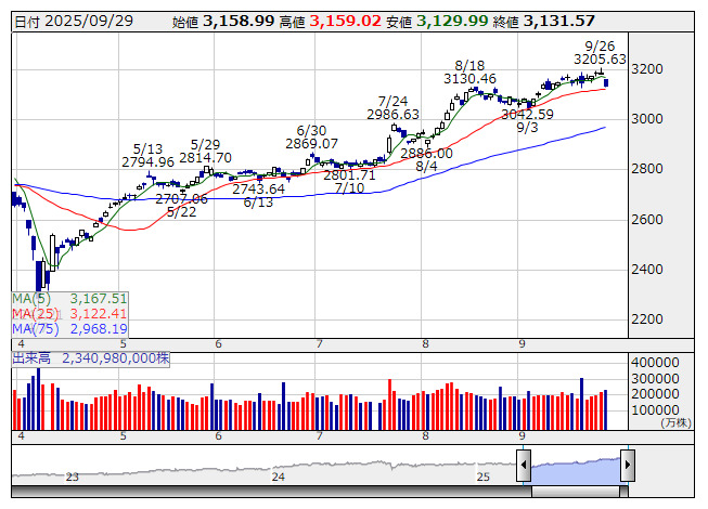 2025年09月30日08時46分 【市況】TOPIX先物:30日寄り付き=4.5ポイント安、3135.5ポイント TOPIX <日足> 「株探」多機能チャートより 30日8時45分、TOPIX先物期近2025年12月限は前日清算値比4.5ポイント安の3135.5ポイントで寄り付いた。前日のTOPIXの現物終値3131.57ポイントに対しては3.93ポイント高。 株探ニュース