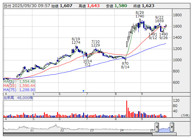 ジモティー <日足> 「株探」多機能チャートより<7082> ジモティー 1628 +34