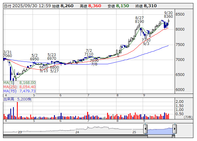 岡谷鋼機 <日足> 「株探」多機能チャートより売上高は5706億4800万円(前年同期比5.7%増)だった。情報・電機事業で情報インフラ関連及び車載部品が増加したほか、非鉄金属部門で自動車関連及び環境配慮型材料が伸長したことが貢献。また、産業資材事業で自動車関連及び航空機向け部材が増加したほか、生活産業事業で昨年8月に配管機器事業会社が加わったことも寄与した。