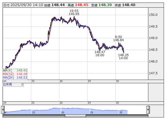 米ドル/円 <5分足> 「株探」多機能チャートより30日午後の東京市場でドル・円は148円30銭台に下落後、148円40銭付近でのもみ合い。時間外取引の米株式先物は軟調地合いとなり、今晩の株安を警戒した円買いに振れやすい。一方、米10年債利回りの底堅さが目立ち、ドルは売りづらい地合いに。