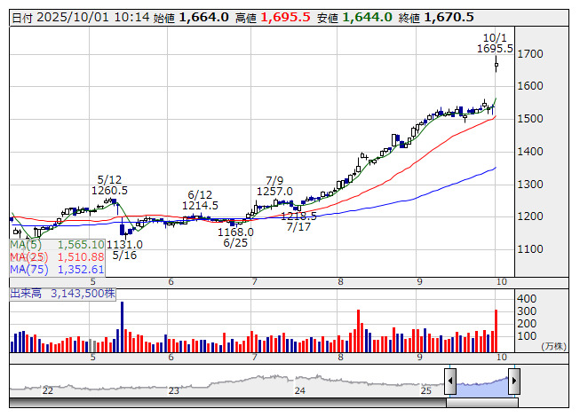 2025年10月01日10時14分 【材料】インフロニアは1年7カ月ぶり上場来高値、今期上方修正を好感 インフロニア <日足> 「株探」多機能チャートより インフロニア・ホールディングス<5076>は大幅高。昨年3月高値(1654円)を上回り、約1年7カ月ぶりに上場来高値を更新した。9月30日取引終了後、26年3月期連結業績予想について売上高を8963億円から1兆1310億円(前期比33.4%増)へ、純利益を334億円から510億円(同57.3%増)へ上方修正すると発表。これを好感した買いが入っている。 三井住友建設<1821>の連結子会社化に伴う影響などを織り込んだ。配当予想も60円から78円(前期60円)に増額した。あわせて2027年度(28年3月期)を最終年度とする中期経営計画の見直しも行った。最終年度の業績目標について、純利益を430億円から630億円へ上方修正した。 出所:MINKABU PRESS